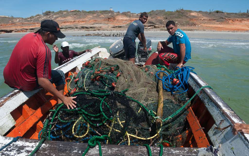 Fishermen on a boat off the coast of Margarita Island, Venezuela, in the Caribbean Sea.