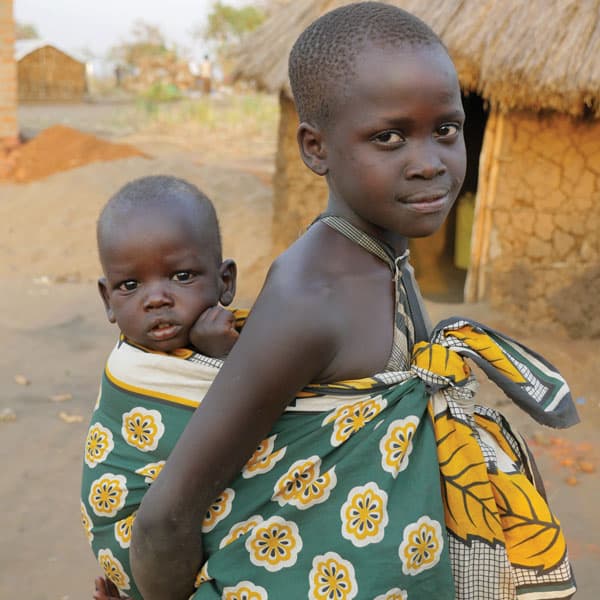Image: A young South Sudanese refugee girl, shown in front of a mud and thatched house called a tukul, carries a small child, probably a sibling, in traditional fashion on her back at the Palabek Refugee Settlement in Uganda. Photo courtesy of Maryknoll Magazine.